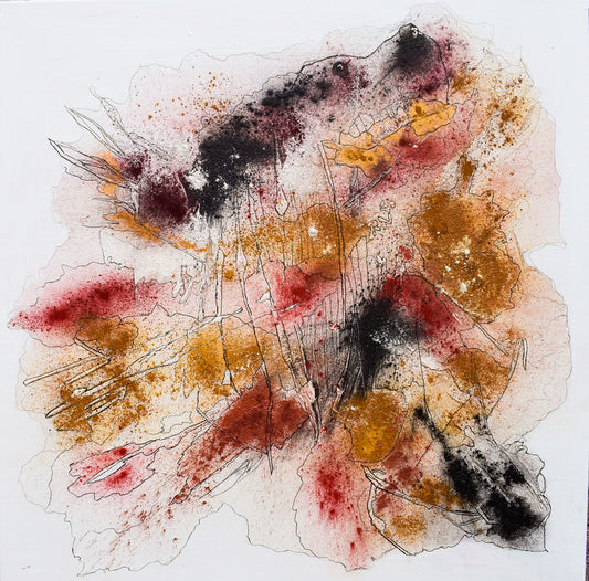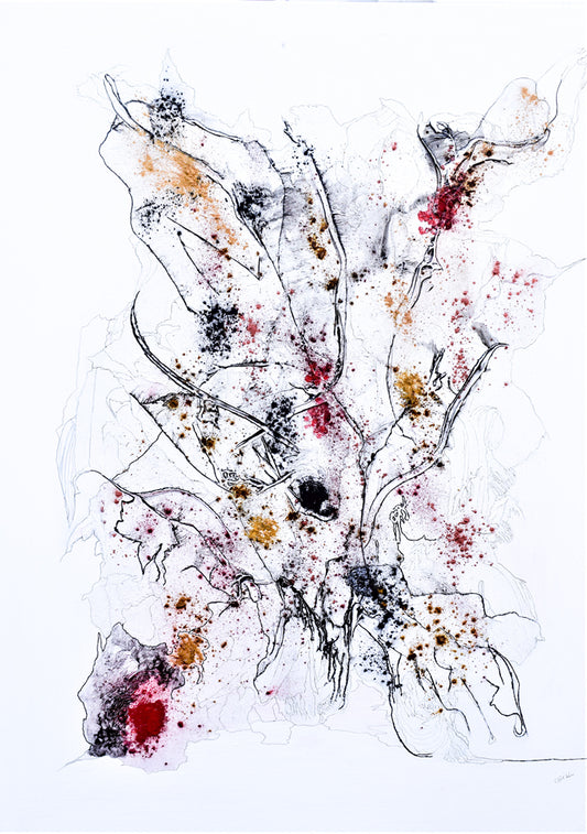 Christian Gill, passionate about cave paintings and the use of pigments, has developed a technique for gluing natural pigments either on gesso, allowing the creation of volumes of material, or on a freshly painted background. This technique preserves the luster and the natural texture of the pigment, allowing the material and the color to express themselves freely. The Indian ink or posca graphics accentuate the relief and suggest intertwined forms. His paintings are intended to be evocative but not directive, leaving the public with freedom of interpretation and emotion.
